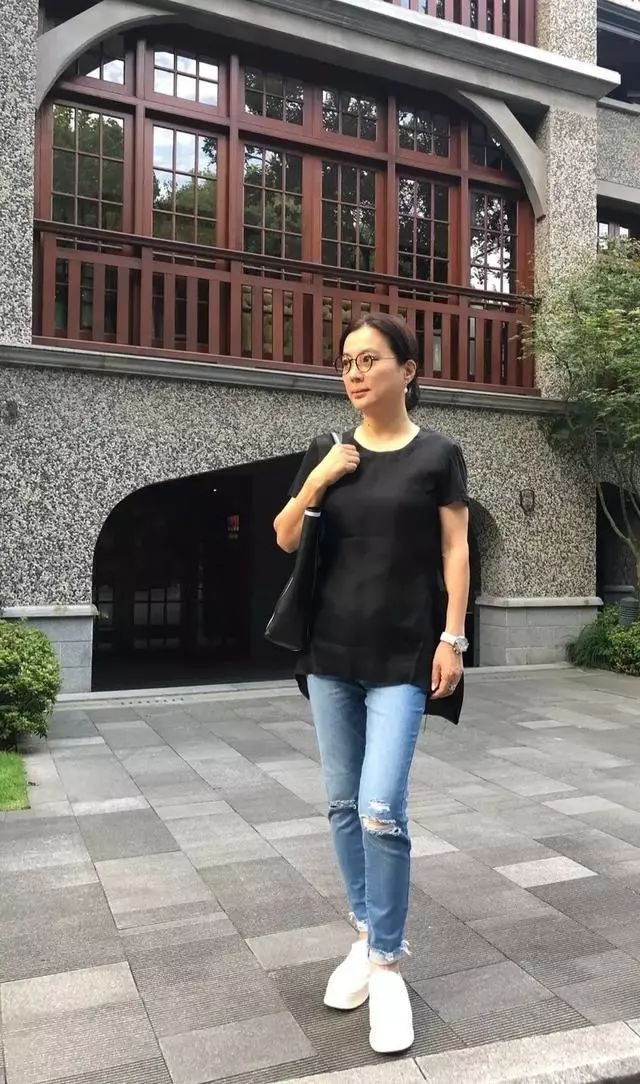 黑色的上衣配着破洞牛仔裤和小白鞋这一身的打扮可以说是非常的清爽了,只不过李玲玉素颜的时候戴着眼镜和房契的发型看上去就有些显老气了。但是这种随性的穿搭却意外的接地气又显亲切呀!