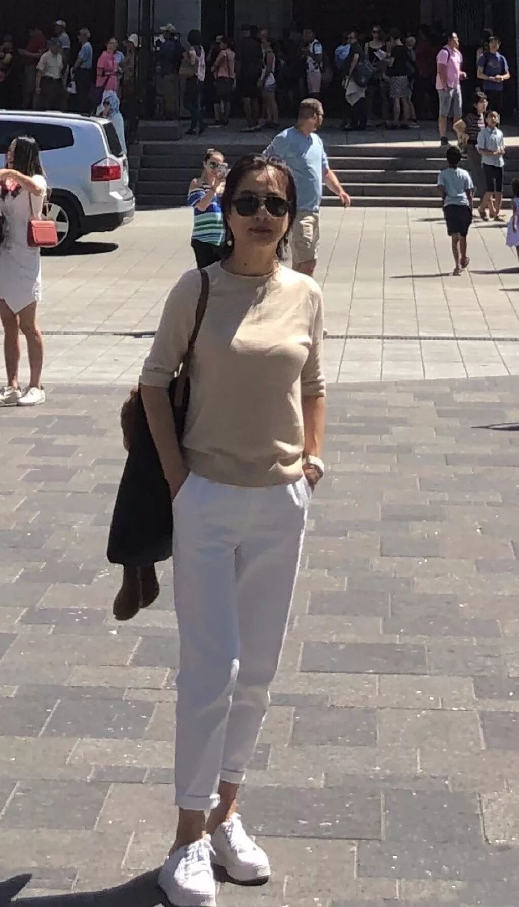 李玲玉的这身打扮还挺好看的,米黄色的上衣配着白色的长裤,再加上小白鞋很有一种青春时尚的感觉,只不过这发型也是差了一点吧,像是好几天没洗一样,硬生生把这一身简单的搭配都显得有点老气了,也是很尴尬呀。
