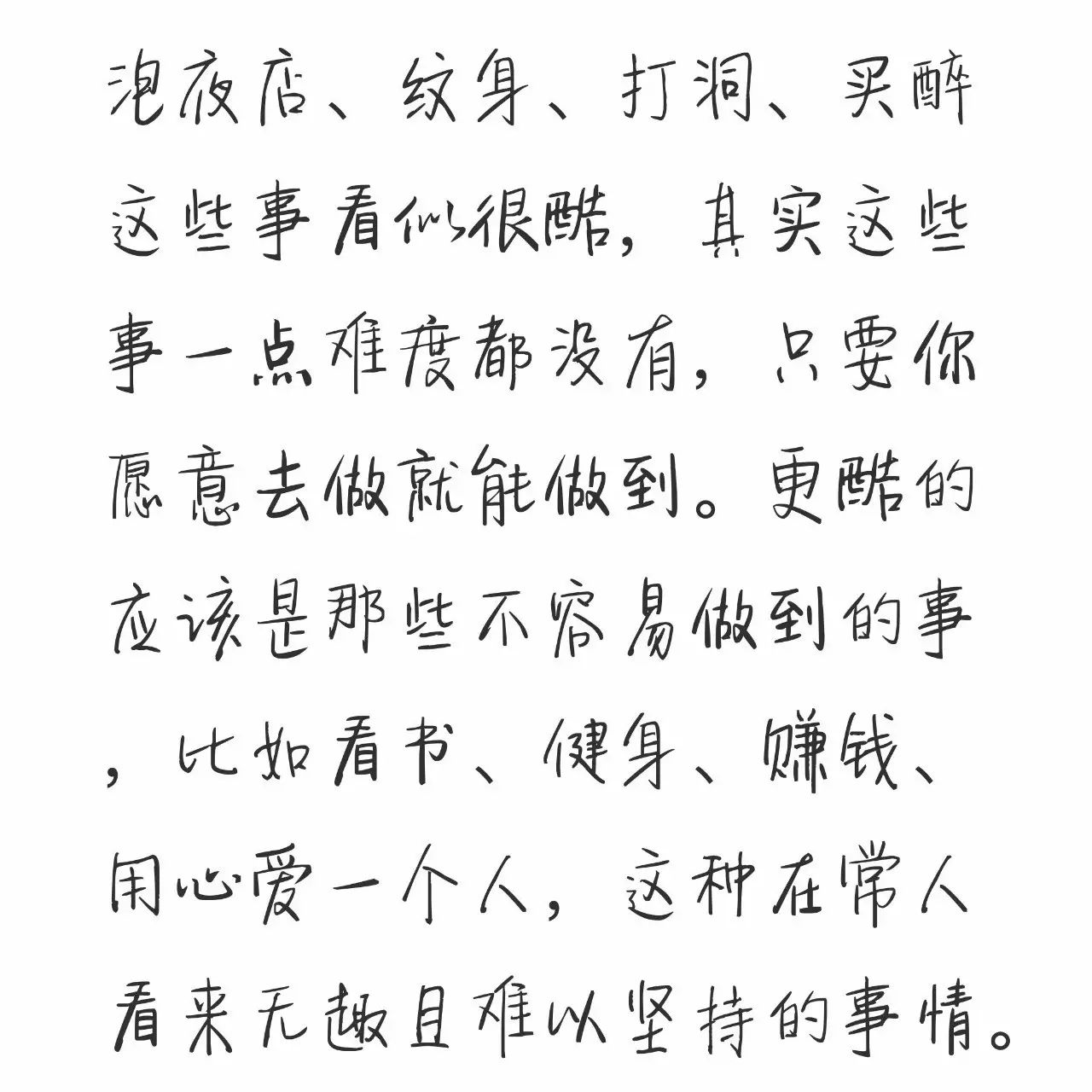 最近朋友圈总是流传着这样一张图,上面写着这样一段话:泡夜店、纹身、打洞、买醉这些事看似很酷,其实这些事一点难度都没有,只要你愿意去做就能做到。更酷的应该是那些不容易做到的事,比如看书、健身、赚钱、用心爱一个人,这种在常人看来无趣且难以坚持的事情。