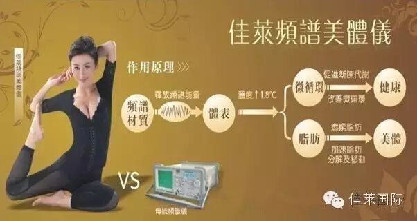 佳莱频谱不是美体内衣,佳莱频谱不是减肥丰胸产品,实际上,佳莱频谱仪是以内衣的形式将频谱理疗仪变成一台可以365天穿在身上的健康理疗仪。它是通过人体的摩擦和静电原理,活化人体组织细胞,增强代谢能力,加速血液循环,启动肌肤细胞,提高免疫力,将频谱治疗简单化、日常化,所以达到了预防疾病,调整亚健康的作用。