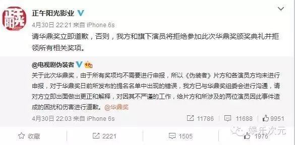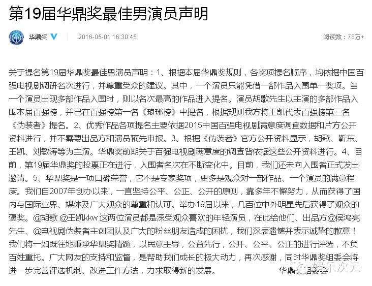 最后,用“华鼎奖是一项口碑荣誉,它不是专家奖项,更多是观众对一部作品、一个演员的满意程度。”来自我标榜,并希望平息悠悠众口。但莫名中枪的演员、剧方、粉丝团又岂是三言两语就能安抚的?好好给个诚恳的交代吧!