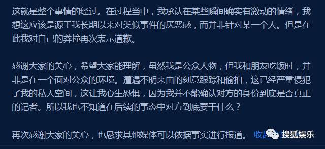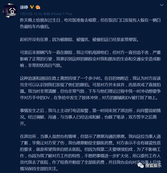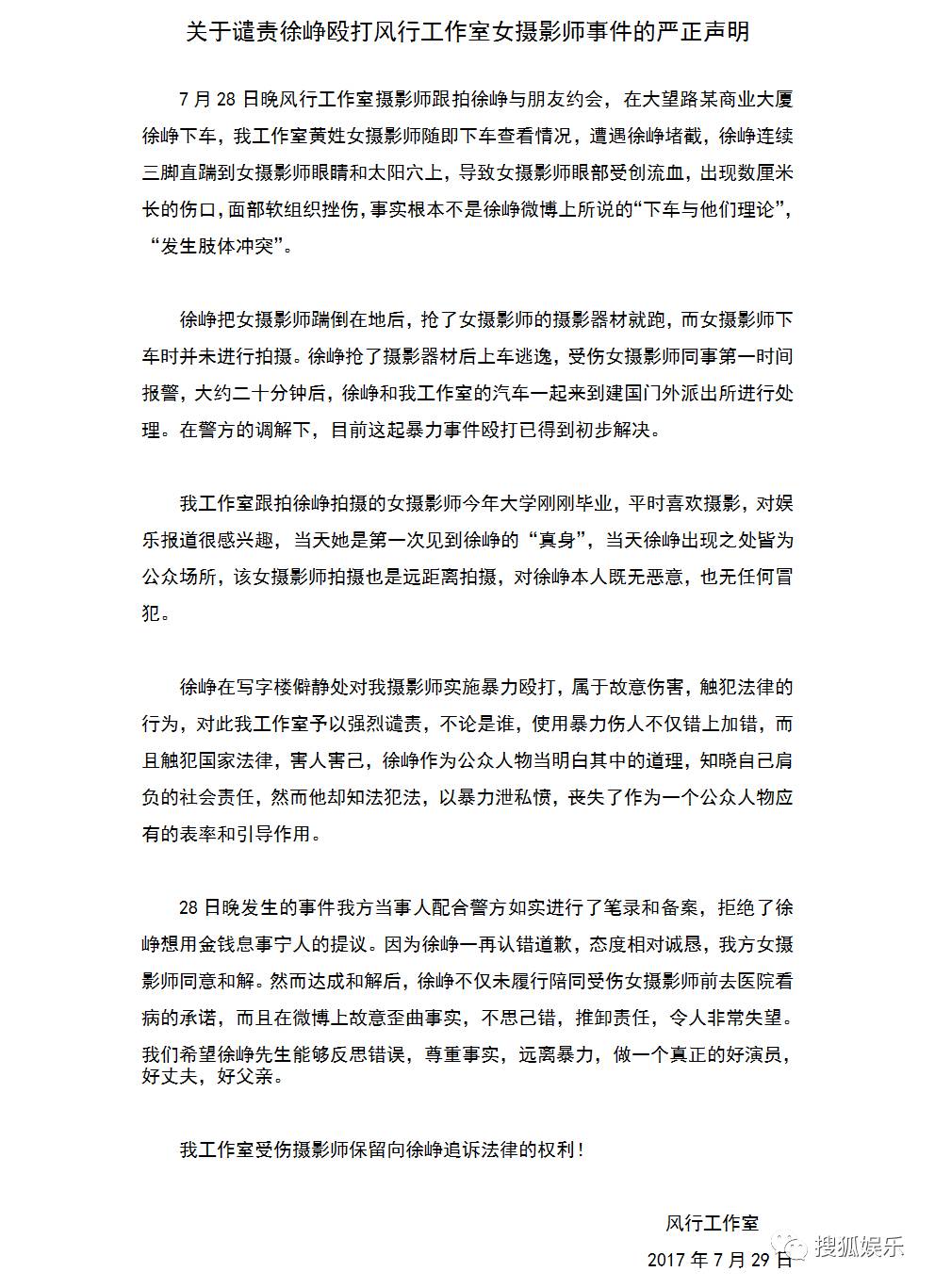 29日下午6时左右,风行工作室针对这次的打人事件,与被殴打的女摄影师联合发表了声明,称希望徐峥先生能够反思错误,尊重事实远离暴力,并保留向徐峥追诉法律的权利!