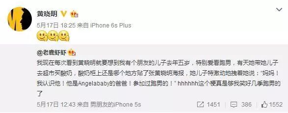 我现在每次看到黄晓明就要想到我有个朋友的儿子去年五岁,特别爱看跑男,有天她带她儿子去超市买酸奶,酸奶柜上还是哪个地方贴了张黄晓明海报,她儿子特激动地拽着她说:“妈妈!我认识他!他是Angelababy的爸爸!参加过跑男的!” hhhhhh这个梗真是够我笑好几季跑男的了。