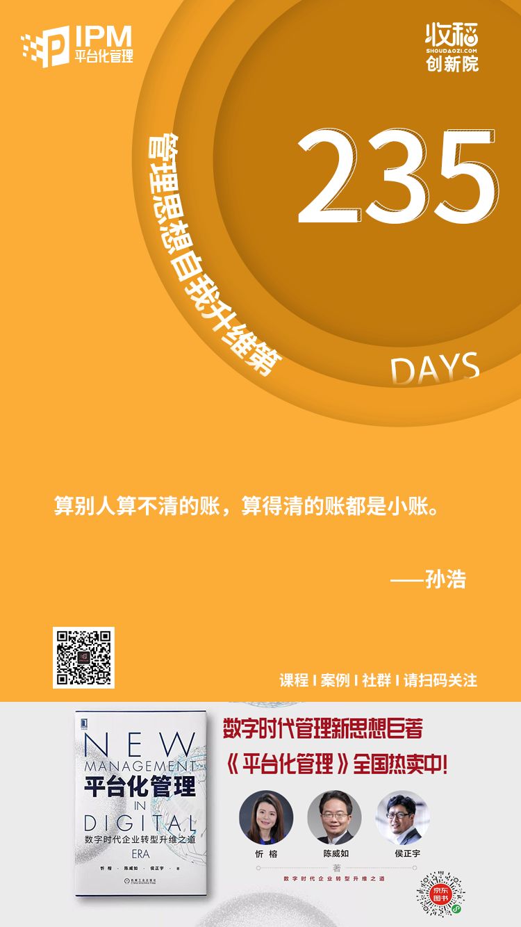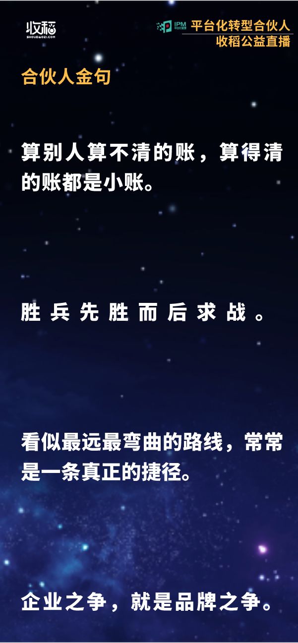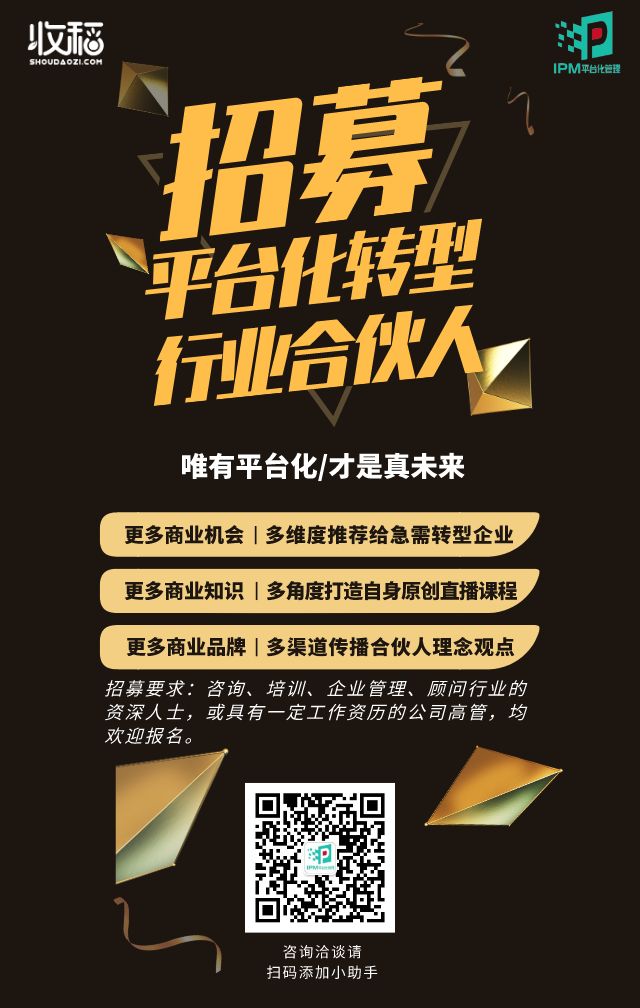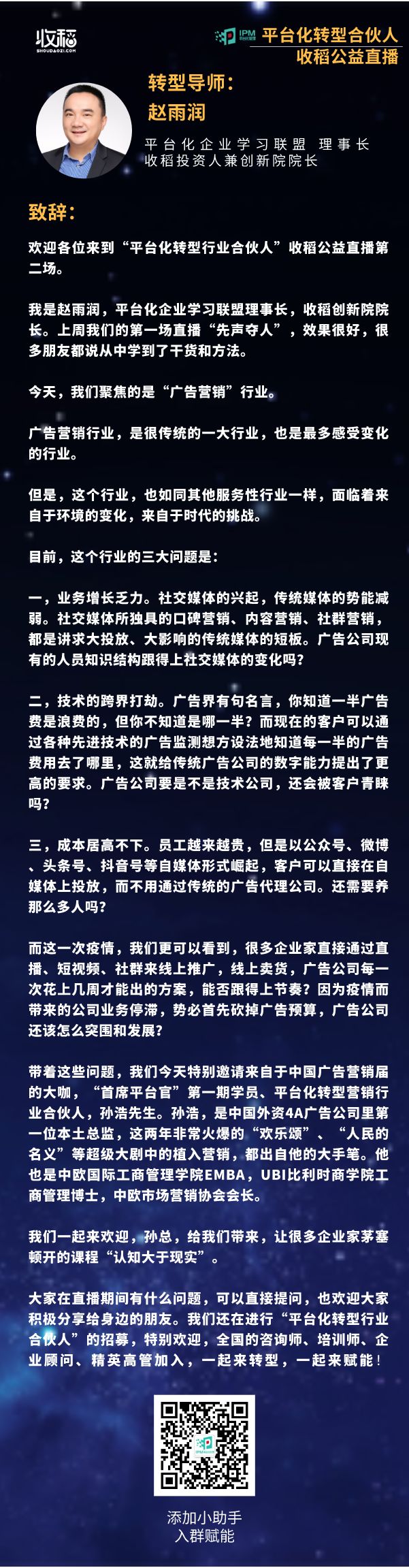 本周的收稻平台化转型合伙人公益直播中,直播嘉宾:“首席平台官”第一期认证营员、营销行业转型合伙人代表、国际4A广告公司首位本土总监、一手策划《欢乐颂》《人民的名义》超级热播剧的品牌营销、中欧市场营销协会会长、锦绣红枫创始人,孙浩先生,对此分享了独到的看法。