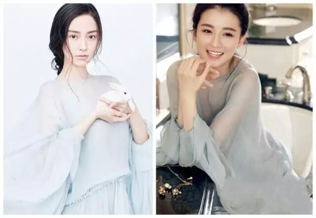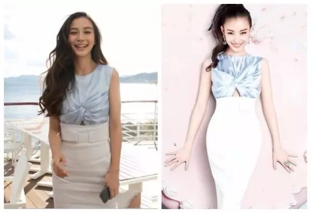 同是女神穿上一样的衣服却有着差距,同样设计的蓝色上衣,,颜色的饱和度度也会影响整体效果,杨颖的上衣蓝色会更鲜艳,饱和度更高,完美地衬托出白皙的肌肤,扎起马尾更是显得清爽干净,而林心如的上衣蓝色饱和度相对低些,虽然也简洁大方,但会稍微显老。