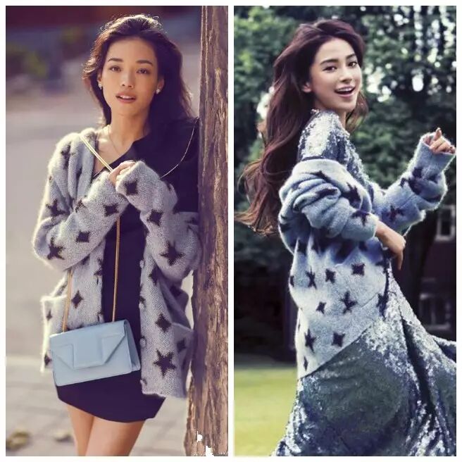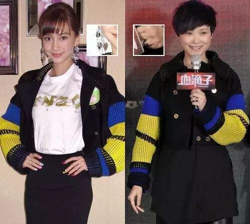 舒淇撞衫杨颖,同样星星图案的淡蓝色外套,舒淇在里面搭了一条中长的黑色裙,显得性感又优雅,杨颖则是在里面搭配一席长裙,微卷的长发显得风情万种。