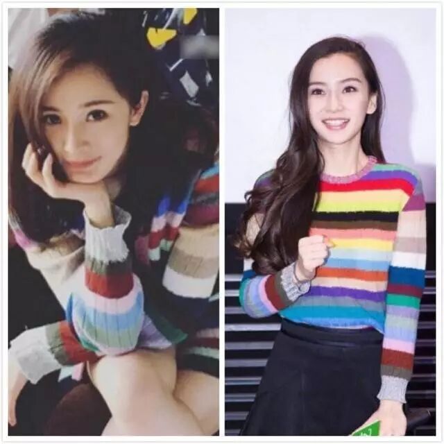 有颜就是任性!这件彩虹色毛衣杨幂穿上后显得清新脱俗,悠闲又时髦,展现了都市女性的知性美;而杨颖穿上后则会有种土的气息,这次杨颖输给了大她两岁的杨幂。