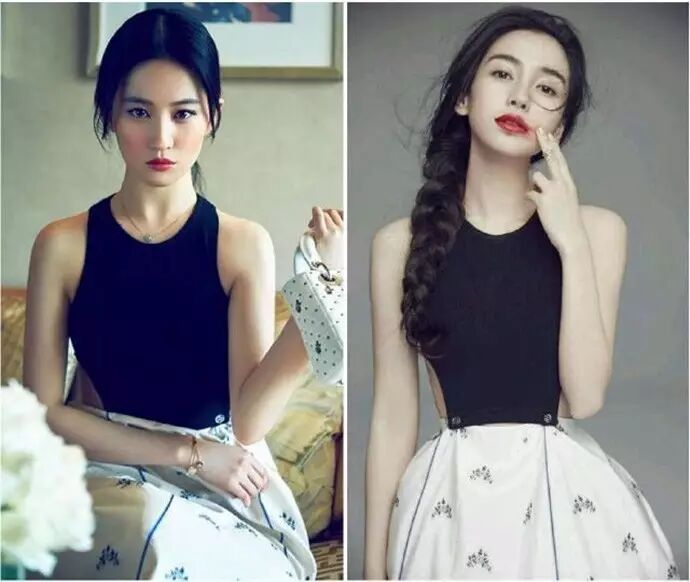 黑色背心,杨颖撞上了仙女姐姐刘亦菲,杨颖左侧分的卷发看起来有点小俏皮,刘亦菲的扎发看起来十分清纯可人,因为杨颖身形更为纤瘦,所以仙女姐姐这次完败。