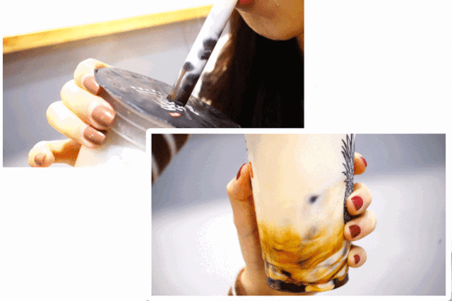 杯底沉睡的软萌粉圆立刻被唤醒,黑糖酱和鲜奶瞬间融为一体。