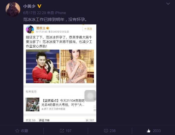 对此,范冰冰工作室宣传总监及时发布微博澄清“范冰冰工作已排到明年,没有怀孕。”