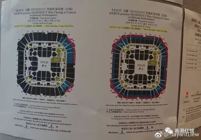 今次两场门票约提供共8000张门票出售,6月18日较少约3000张,6月19日较多约5000张,这次每人限购4张,因此预计门票相对好买,特别是480港币门票更好买。注意6月19日场才是真正的尾场。