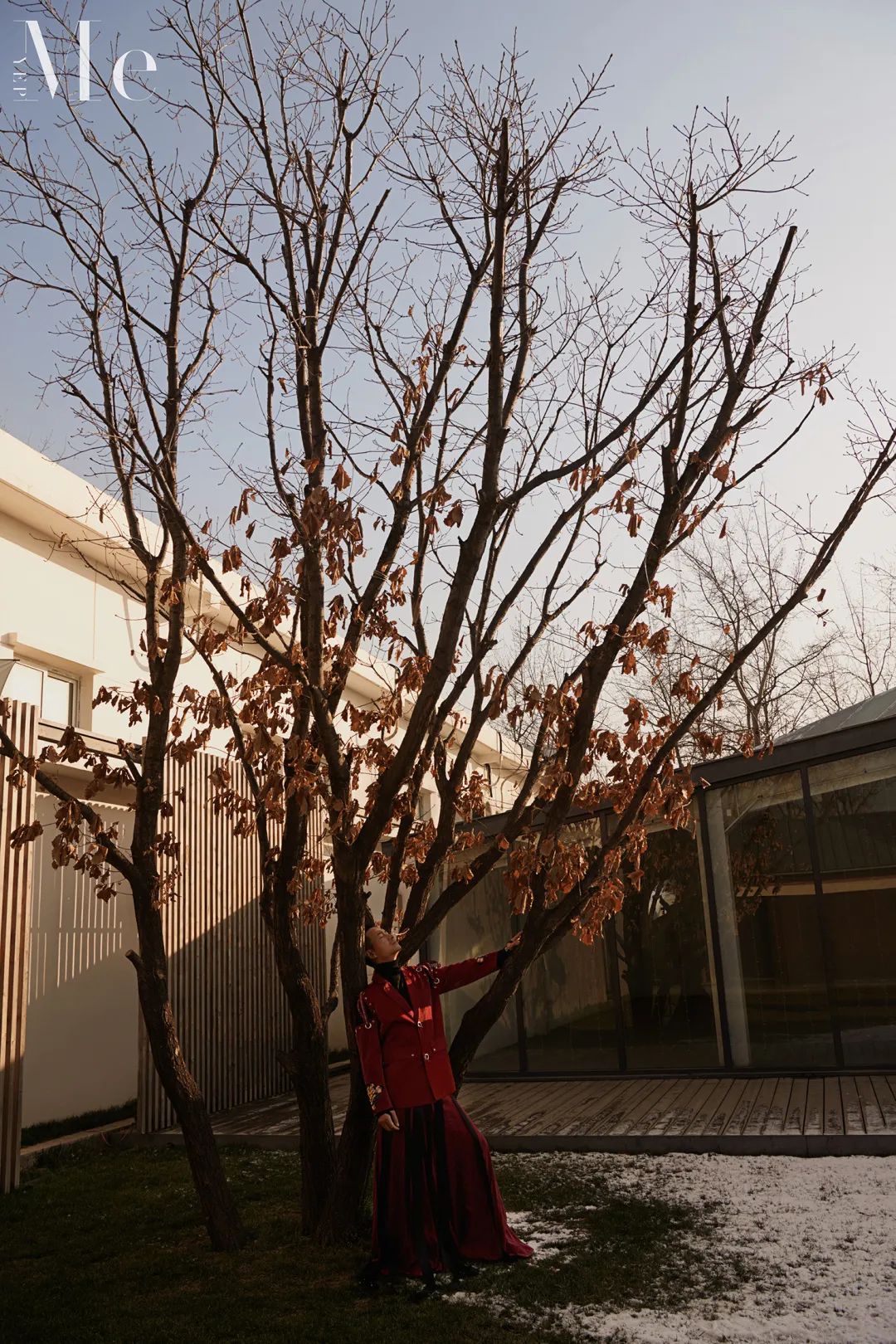 翻领针织镂空刺绣西装外套、飘带拼接暗纹阔腿裤:Esa Liang