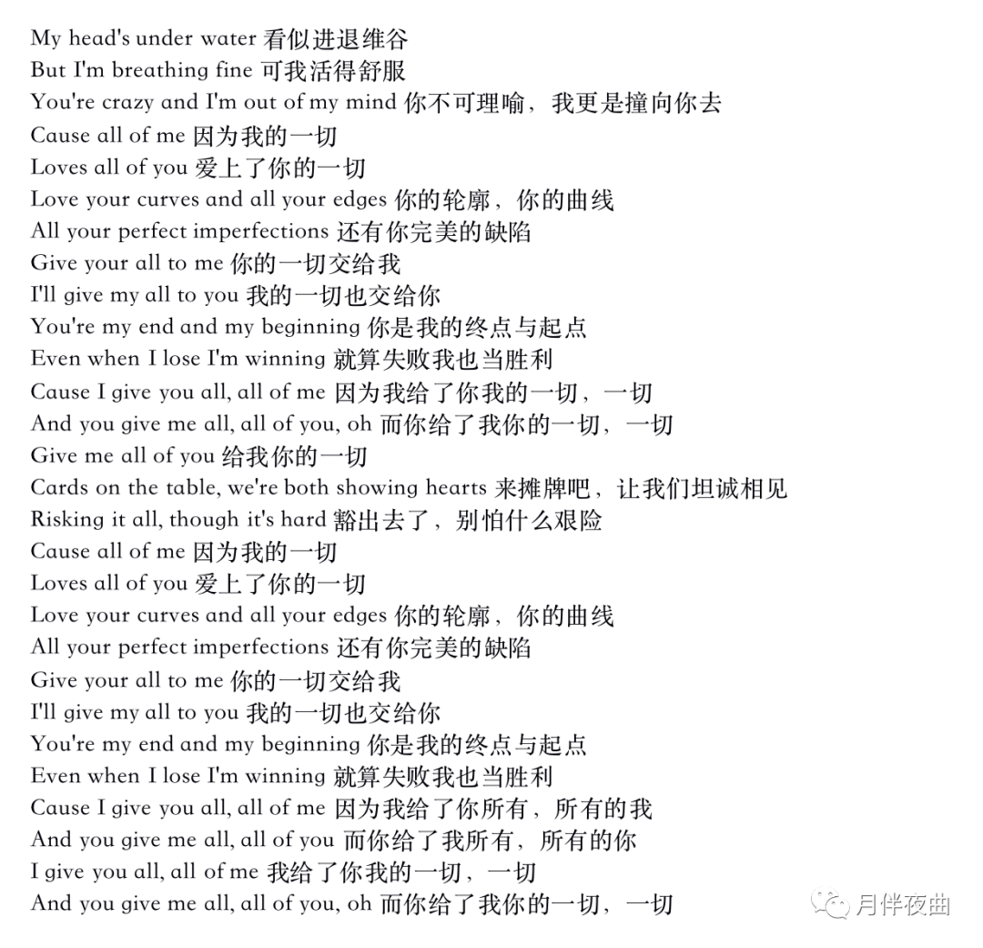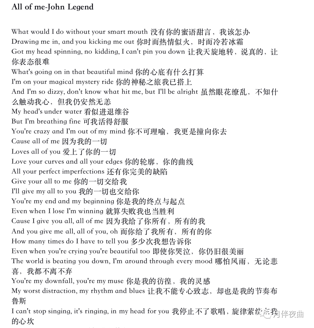 与国人含蓄的表达不同,约翰传奇的歌词直接露骨的表达着对妻子的浓浓爱意,在这段直白的文字中我最喜欢这句歌词:“love all your curves and edges,all your perfect inperfections”。即使面对对方所有的缺点和不完美亦可以包容,即便在世俗眼中是不好的,也同样爱(真爱无罪)。就如歌词里面写的,爱你的温柔,更爱你的棱角。