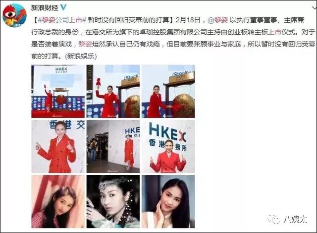 不过现今黎姿已经不再拍戏了而是专心从上开公司,不久前黎姿的公司还上市了,黎姿本人出席了敲锣仪式↓↓↓