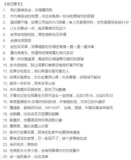 同时小星发现唯品会官网贴出了一份招聘启事,招聘“惊喜助理”。仔细一看,满满100条要求!!!可以说是最丧心病狂的招聘要求吗?话不多说,上两张图来看看!!!