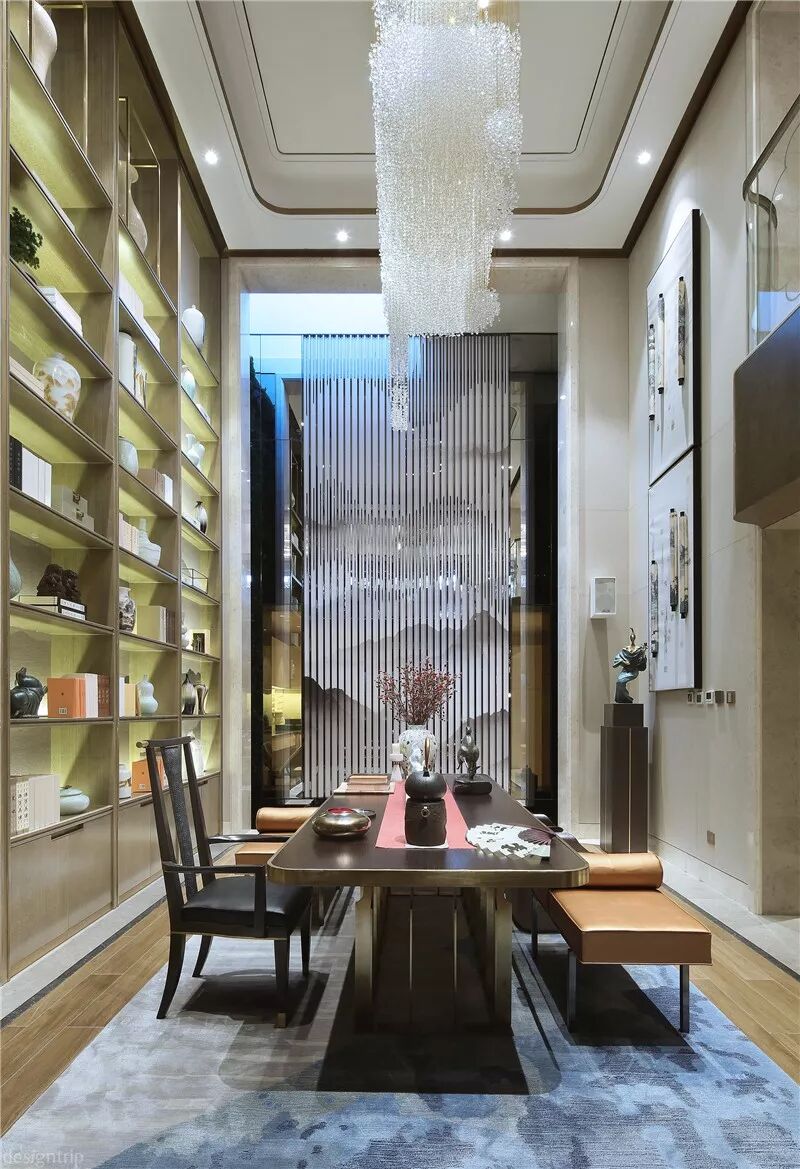 书房于中庭共享空间之中,气势高耸的书架,以简雅之器与古博之书突显了中式人文气息。