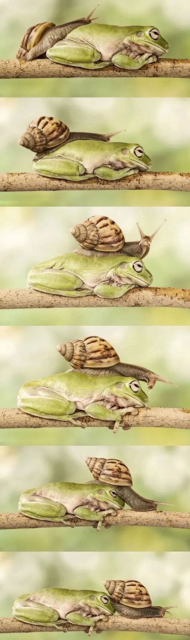蜗牛与青蛙的温馨邂逅。青蛙一动不动,是因为它被粘住了,根本动不了,它将保持这个姿势,一直到死。