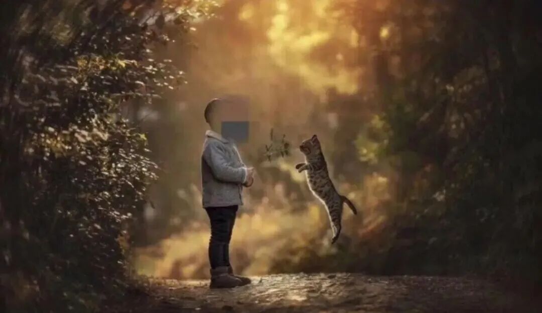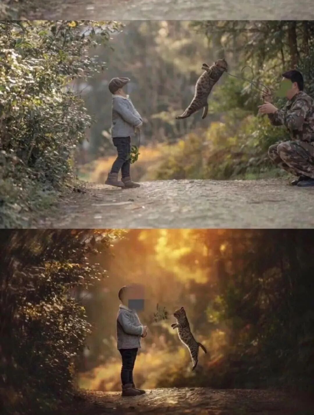 摄影师的助手把绳子套在小猫的脖子上,使劲往后拉、往上拽,制造小猫腾空的画面,后期再用PS修掉。