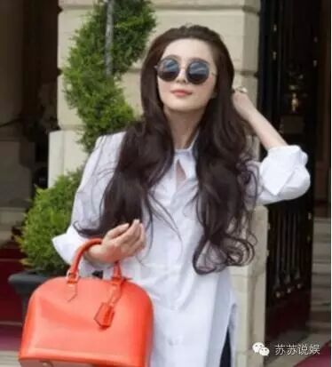 范冰冰,橘色包,黑色复古墨镜,长款白衬衣,配大波浪长发,风情万种女人味十足。