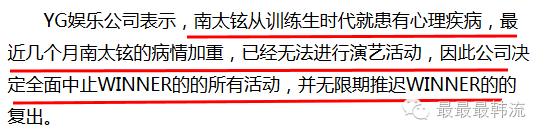 ——南太铉在练习生时期就有心理疾病,最近他的病情加重并无法进行演艺活动,因此公司决定全面中止WINNER的所有活动,回归无限期延迟。
