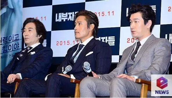 李秉宪、曹承佑、白润植今(8日)出席新片《局内人》的记者会,《局》片将于11月在韩上映。