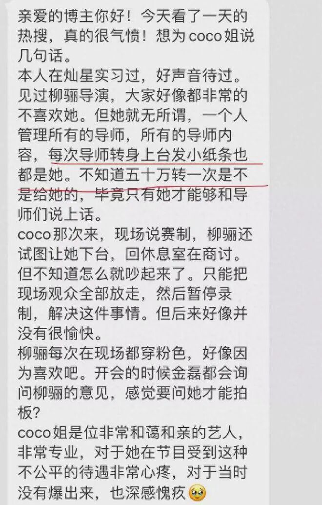 整李玟的大佬,你惹不起! 燕梳楼 港台女星 2023-08-21 21:36:12 327 创作不易,用心坚持,欢迎请BaGua喝几杯爱心咖啡!打赏并支持本文 打赏并删除本文 作者 | 燕梳楼这些天,《中国好声音》听到的全是坏声音。8月17日,网传天后李玟生前一段9分钟的音频,血泪控诉好声音导演组操纵黑幕并整她。我们无法确认,这是否与她加重病情自杀离世有多少直接关联,但我们想知道,李玟说的是不是事实,背后有没有晋级黑幕,是不是故意在台上羞辱她。李嘉捷是第一个站出来声援李玟的好声音学员,通过长文揭露高额的“转腚费”黑幕,总决赛前十名都可以买的,想留下先签约,10年起步,然后就可以操作获奖。面对导师之死,李嘉捷表现的言辞激烈,呼吁“希望能好好调查一下这些恶臭的人”,并骂几个导演为“畜生”。但发文1小时后就贴文就消失了,李嘉捷对此称“我没删,非我删”。更为诡异的是,次日上午李嘉捷突然发文道歉,称自己之前所说的没有事实依据,“向社会各界以及好声音节目组表达歉意”。前后态度转变之大,令人怀疑遭遇胁迫。联想到有网友因为喜欢李玟连发数条视频,后遭遇死亡威胁,不得不删除视频并痛哭称“虽然我喜欢Coco但我更想活着”的遭遇,让人不禁后背阵阵发凉。但这段录音引发的舆论并未就此消失。此后好声音学员徐海星、梁晓珺、河川敷都纷纷出来指认自身遭遇的不公正遭遇,也从侧面印证李玟所言非虚。可能是迫于压力,好声音节目组紧急声明,称网传9分钟录音为网友恶意剪辑,是对逝者的不尊重,也严重损害了节目形象,表示严厉谴责云云。这种傲慢无礼的态度让舆论更为愤怒,有媒体直接回怼,说人家恶意剪辑,那就拿出现场完整录音来。同时,网友也把目光集中在李玟组的两名学员王泽鹏和周菲戈身上。有人甚至骂周菲戈,老师为当初就是为了你而质疑赛制不公受辱,你这时候还当缩头乌龟吗?我觉得这确实有点为难两名学员了,因为他们非常单薄,面对这样一种势力根本招惹不起,可以说是赌上了自己的未来,被封杀事小,就怕遭遇更大麻烦。但周菲戈最终还是站了出来,公开了与李玟对话的音频,并表示非常自责,认为李玟是因为自己而与节目组交恶,并在台上受到当众侮辱。而王泽鹏也站出来实锤坏声音。当时李玟有提前和节目组沟通,说自己腿上有伤不能长时间站立,并且有X光片为证。节目组表示会安排王泽鹏在旁边。但节目组并没有告诉王泽鹏,反而把王泽鹏安排到离李玟很远的地方。李玟上台前给王泽鹏微信发了多条语音,告诉他站在自己边上,好让自己有个支撑。诡异的是,节目组收走了王泽鹏的手机。也就是说,节目组既不通知王泽鹏,也让李玟找不到王泽鹏,最终李玟在台上摔倒,坚持坐着完成录制。决赛中我们看到的画面都是李玟的上半身,以及试录时的影像和声音。所以才有李玟那一段生前录音,声称从业28年,从来没碰到过这么可恶的导演。为此,导演柳骊的大量私人信息也被曝光,并被贴上身家过亿、背景惊人的标签。她也曾在社交账号发出两狗对视的视频,疑似内涵网友。但当时为了学员的前途,李玟选择了隐忍,她明知是导演故意整自己,还反过来安慰王泽鹏,“他们说什么你必须要听啊,年轻人现在要的就是机会。”在长文中,王泽鹏称之所以没有第一时间站出来,是因为怯懦,这段时间度日如年,但反复听着李玟老师的一段段长语音,还是决定鼓起勇气说出真相。今天,韩红也站出来为好友李玟发声。她说作为coco的好朋友,我认为她是一个善良诚实的人!我信任她也心疼她!这是录音事件曝光后,最有份量的一次声援。除此之外,甄妮、金星、杨培安、张伦硕、乐嘉、韩佩泉、刘雅瑟、王泽鹏、徐海星、乐嘉等,都先后发文支持李玟。他们不是不知道得罪蓝台的结果,但他们还是义无反顾地站出来,揭露背后的真相。李玟没看错人,他们都是正直的人,也是战士,值得我们鼓掌。事实上,站出来的何止是这些明星和深受其害的学员,还有千千万万个我们。我们支持调查呼唤真相,戳破文娱圈背后的种种黑幕,惩恶扬善激浊扬清!如果李玟这样级别的天后级艺人,都遭受这样的羞辱,何况那些普通的年轻艺人。当初他们请李玟来,李玟也真的以为这是一个音乐的殿堂,所以不惜抱病参加。但当他发现比赛充满黑幕,晋级全是操纵,导师只是那个配合演戏的小丑时,她怒了。那季好声音,除了李玟全是假的,人家都是挣钱的,只有她是真的去当导师的。所以他才会为淘汰的周菲戈据理力争,怒斥黑幕。她是真把这些追求梦想的学员当孩子啊,但由此她也遭遇了节目组的故意羞辱。昨天还有读者说,李玟有点委屈怎么了,又不是什么大牌。持这种认识的人确实有一定代表性,很多人不知道李玟到底有多厉害,在国际上有多大影响力。她是首位全球发行英文专辑的华语歌手,也是首位登上奥斯卡金像奖颁奖典礼献唱的华语歌手。她在国外的歌迷甚至比在中国还多。但她始终自称“武汉姑娘“,在很多顶级舞台上以中国人为骄傲。在成为首位登上奥斯卡金像奖颁奖典礼舞台的华人歌手时,她特地把头发染成黑色,穿着红色旗袍。就是这样一个顶流的歌者,一个热爱自己国家的艺人,却因为指出节目组的一些黑幕而遭遇当众羞辱甚至动手,把她的尊严按地地上摩擦,确实让人悲愤。她是坠落人间的天使,我们不该让她在天堂哭泣。面对舆论汹涌,作为《中国好
