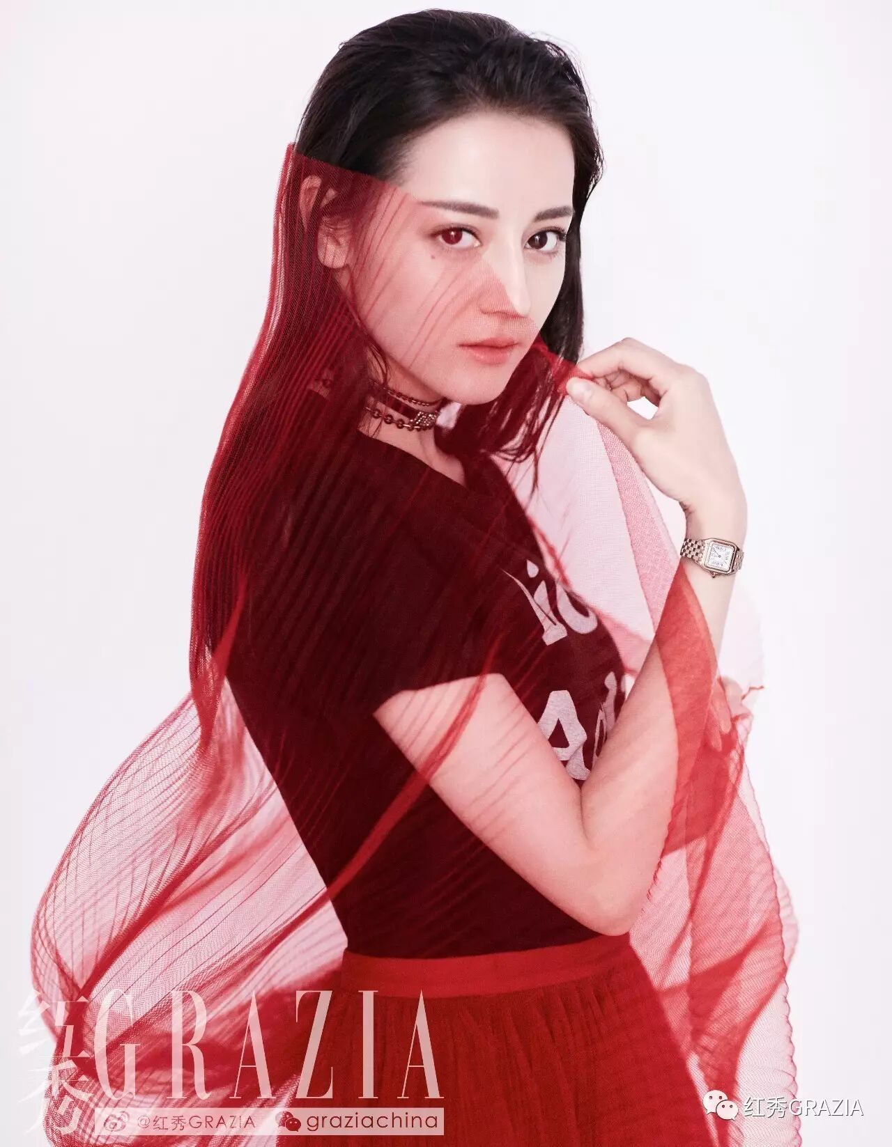 ▲黑色字母T 恤、红色纱裙(均为Dior)Panthère de Cartier 腕表(Cartier)