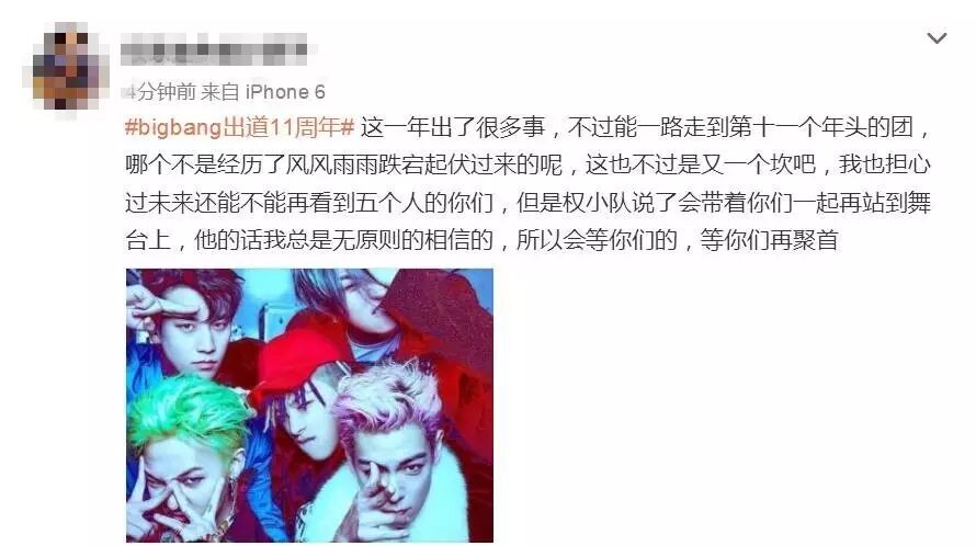 “Bigbang出道11周年了,生日快乐”,并特意配上了花花绿绿的图片。