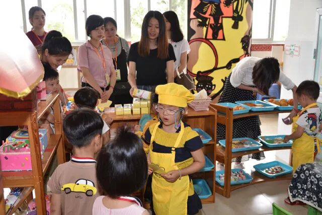 首先开展的是东石镇镇级开放活动,各姐妹园的老师们选择了自己喜欢的年龄段,深入到班级观摩幼儿区域活动的游戏情况。中一班生活区里,孩子们熟练地撬着海蛎;中三班的表演区则紧锣密鼓地梳妆打扮准备演出;小二班的宝贝们认真地制作甜品,你来我往地买卖着;小四班的宝贝们忙碌地穿梭在汽车清洗区、修理区、骑行区。各班的特色区各展风采,深深地吸引着前来观摩的老师。