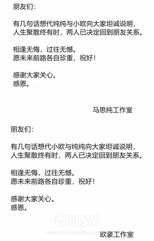 又是一对被看好的情侣分手。马思纯和欧豪分得相当体面。没有不好的传闻,没有意味深长的微博,没有somebody跳出来演戏。