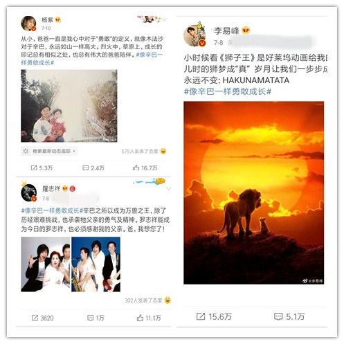包括一些明星,在看过《狮子王》之后,也按捺不住感动,纷纷发博,追忆父爱,感恩成长: