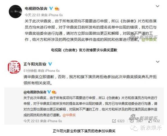 《伪装者》的官方微博和正午阳光影业都要求华鼎奖道歉!