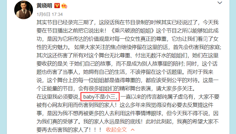 十几分钟后,黄晓明也发布了一条近500字的小作文回应,除了声明“baby不是小三”,还得费心找补baby文中指责的“节目噱头”,看似霸道,却得处处周全,谁都不得罪。
