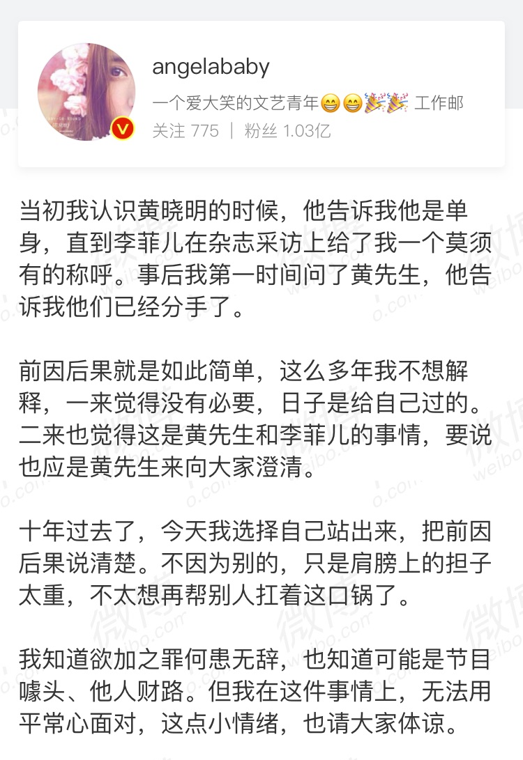 赶在下班前后,大家都百无聊赖的时候,baby突然发微博澄清自己不是黄晓明和李菲儿之间的第三者。