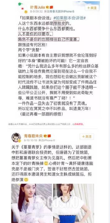 曾经还有女演员为抢角色开撕的新闻闹到台面上来,如果COCO没记错,那部剧叫《蔓蔓青萝》。叶青控诉姚笛抢走了自己的女主角,在微博里控诉她“跟强盗没什么分别”。