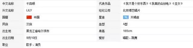 千百顺(LILY),华语流行乐坛女歌手,有着北方女孩个性十足的豪爽大方,也有南方女孩清秀可人的精致外形,在亮相星光大道后,以前卫多变的造型与丰富的舞蹈被人熟知,很快也成为最具观众缘的歌手之一,而她一副嗓音清亮通透、悠长气息力量十足,多首不同风格的歌曲在她的演唱中,都拥有了独树一帜的特色标签,令她的音乐充满了"百变魔力"。2013年11月,携手北京博艺唱片正式推出新单《我不是个好东西》、《我真的会放电》、《圣女》。