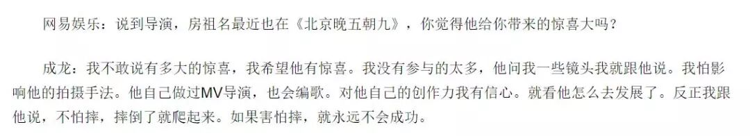 成龙也曾经在采访中也被问到怎么看待《北京晚九朝五》这部作品,他表示并没有参与太多,但相信儿子的创作能力。“在哪摔倒就在哪爬起来,如果害怕摔,就永远不会成功”。毫无疑问成龙大哥对儿子也是寄予厚望。
