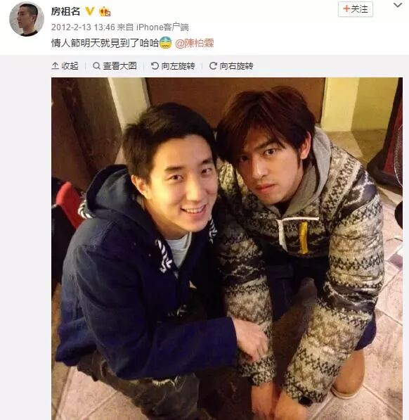 陈柏霖是房祖名关系最密切的人之一。这对“绝世名霖”好基友微博互动相当频繁,什么情人节啊聚会啊,约电影约打球,经常隔空合影微博传“情”。粉丝都调侃房祖名的微博日常是“吃饭睡觉陈柏霖”,也是很形象了。