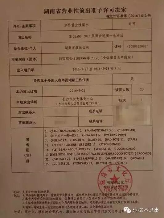 BIGBANG2016见面会巡演--长沙站作为湖南省演出公司2016年度承办的第一个项目,在主办方3月8日行政许可报批材料准备齐全之后,我公司严格按照项目审批手续,于3月9日报送公安机关相关部门,3月10日获得行政许可批复。为加强防伪措施、保护广大歌迷正当权益,我公司会同组委会组织专门团队加班赶制门票、强化门票防伪标识,并于3月20日正式出票。
