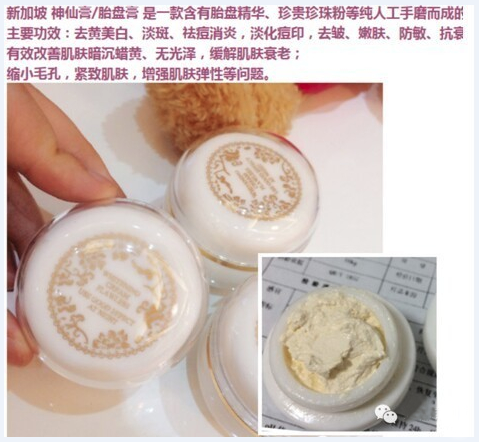 但是对于关于胎盘这么好的效果,小编实在好奇。前段时间去台湾玩,朋友送了我一款搽脸的,说是那边模特圈演艺界非常滴火,专售豪华高端美容院。看起来包装很普通,但是很特别是一个陶瓷瓶罐罐装的,对于朋友的信任就坚持用下来了,一段时间后,小编皮肤确实好了许多!再用一个月的时候就很明显了,后来就到网上搜索了下,原来这个小瓶罐含有胎盘精华,怪不得效果这么好,网络微博众多名人模特都有用并推荐,称之“神仙贵妇膏”,也叫胎盘膏。