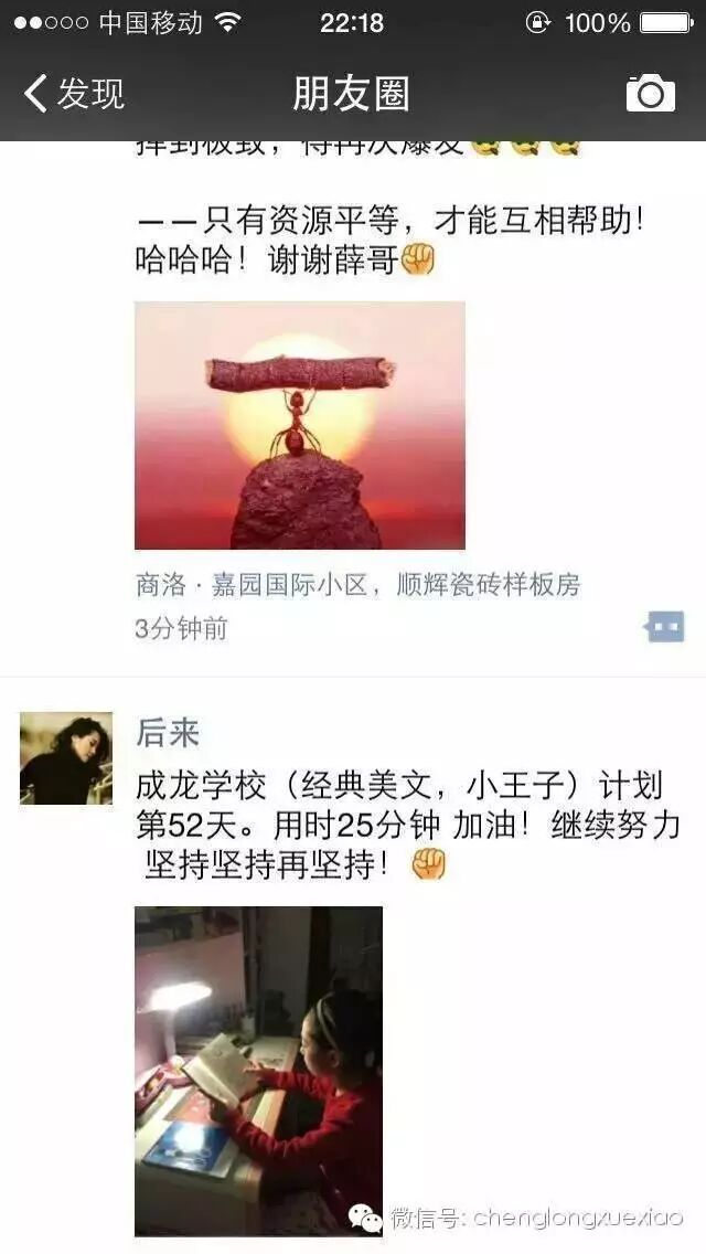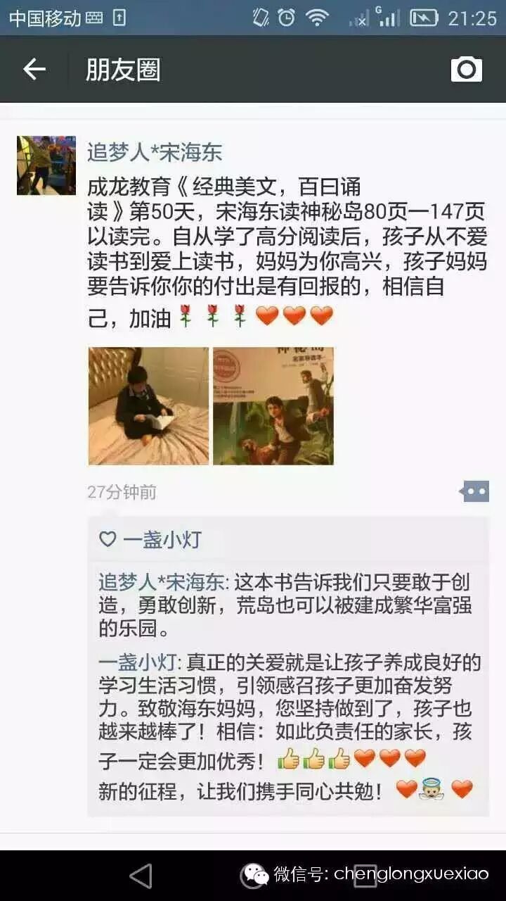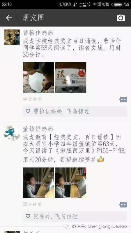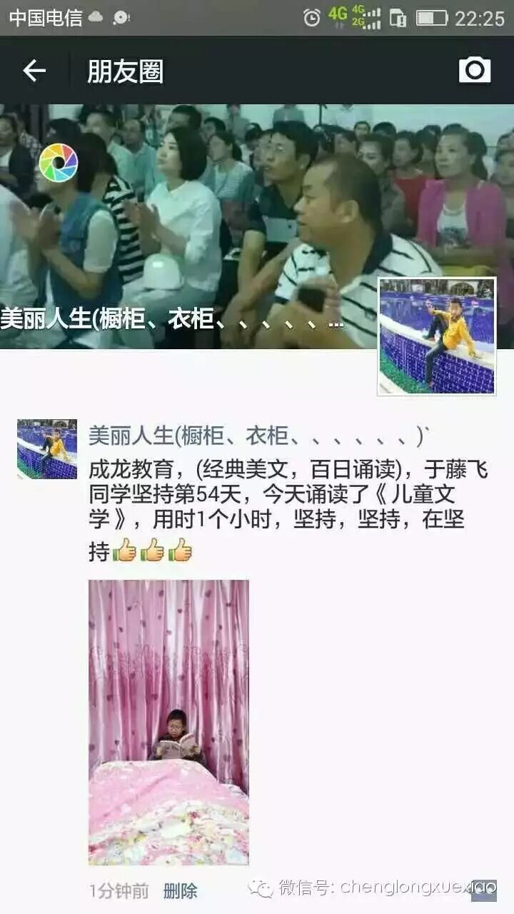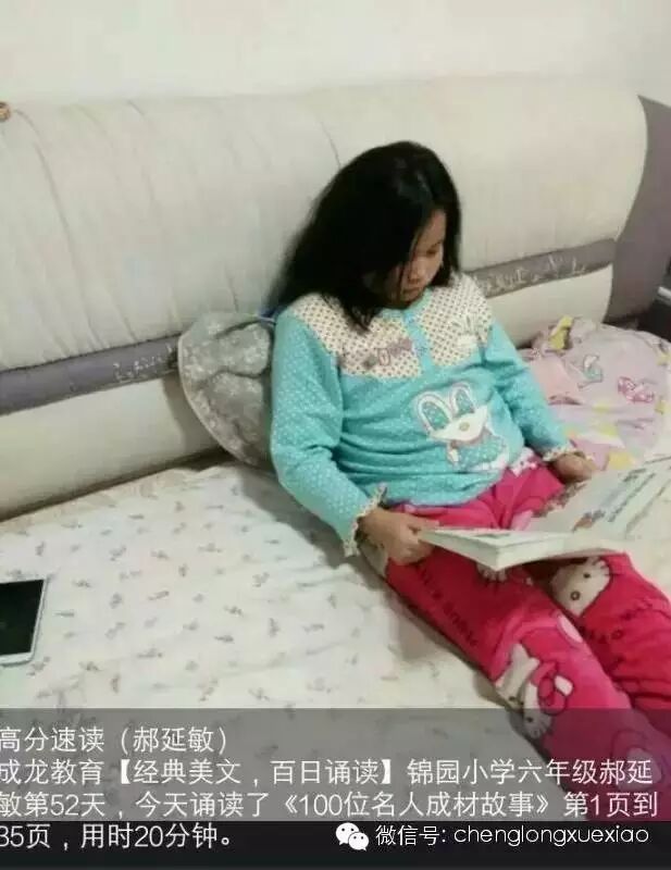 成龙学校自2016年元月16日开展“经典美文,百日诵读”活动以来,得到了许多孩子和家长的积极响应。随着活动的深入,阅读的好处浸润着每一个孩子、每一个家长、每一个家庭。书声琅琅,书香阵阵的动人图片是今年春节最美的风景。最美的风景在微信群中不断传送!