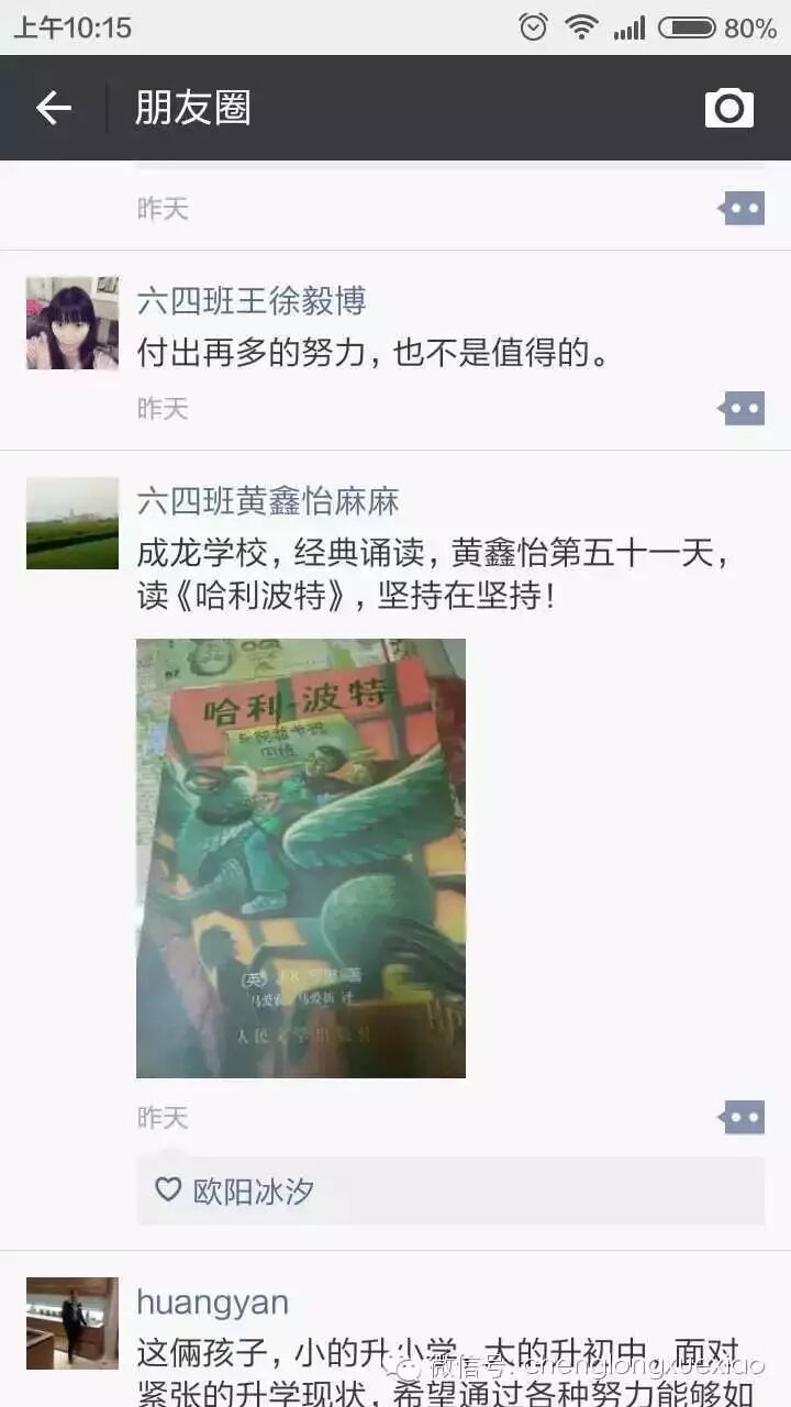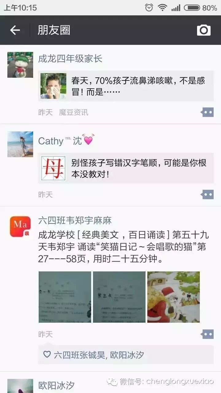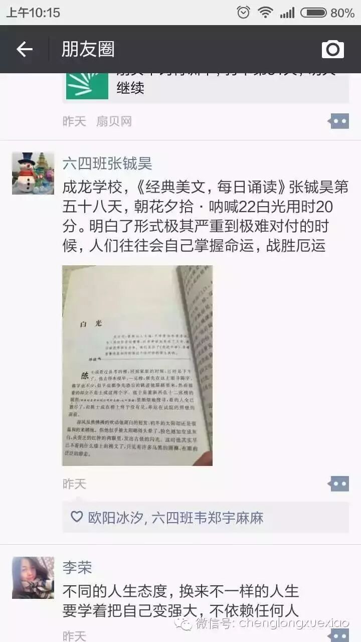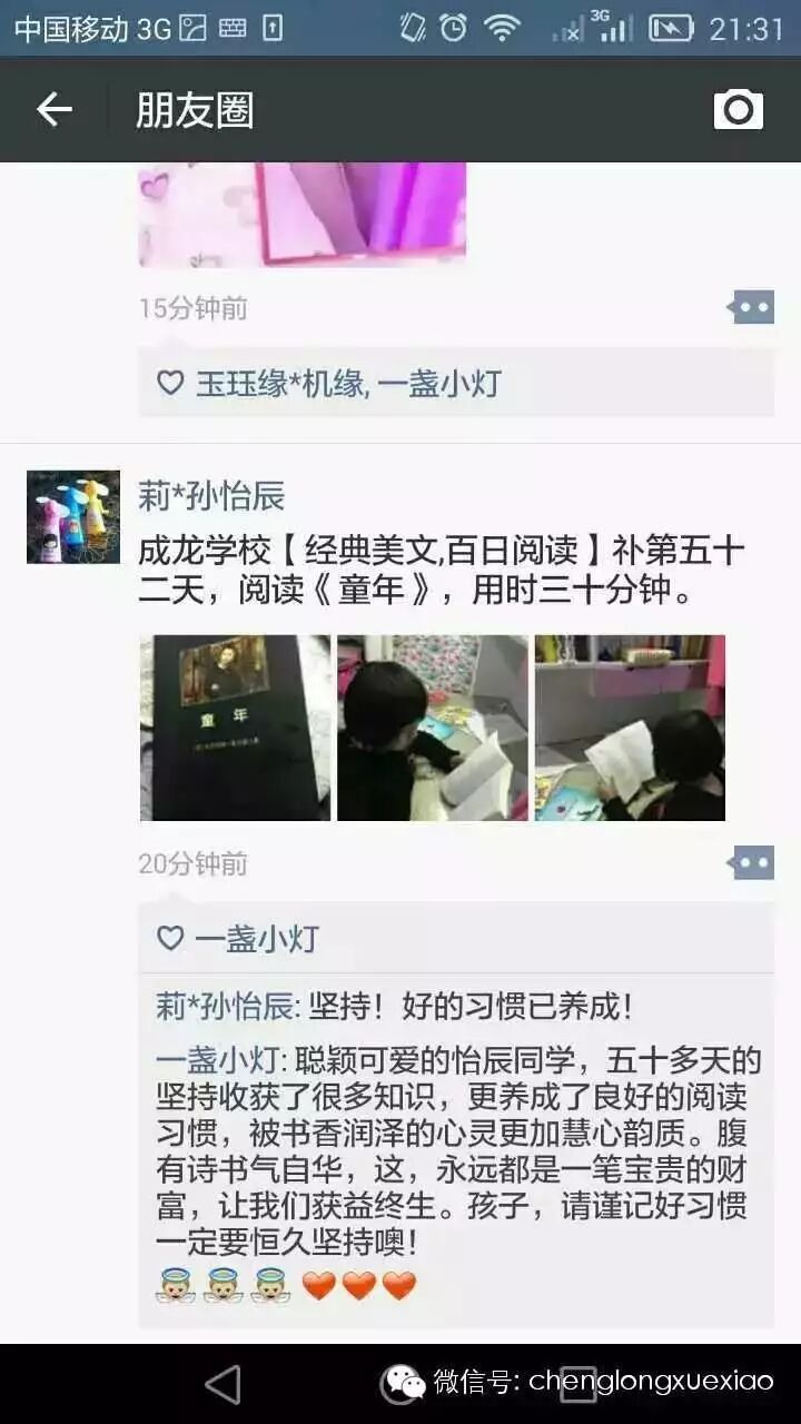 成龙学校自2016年元月16日开展“经典美文,百日诵读”活动以来,得到了许多孩子和家长的积极响应。随着活动的深入,阅读的好处浸润着每一个孩子、每一个家长、每一个家庭。书声琅琅,书香阵阵的动人图片是今年春节最美的风景。最美的风景在微信群中不断传送!