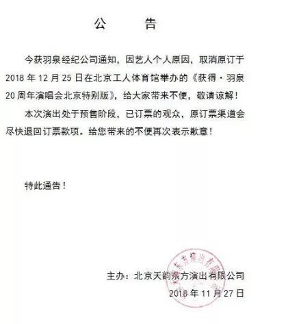 27日,羽泉演唱会承办方发表声明,表示因艺人个人原因,原定于12月25日举办的羽泉演唱会因故取消。同时,大麦网也开始着手进行演唱会的退票手续办理。28日,北京警方确认歌手陈羽凡吸毒被抓。
