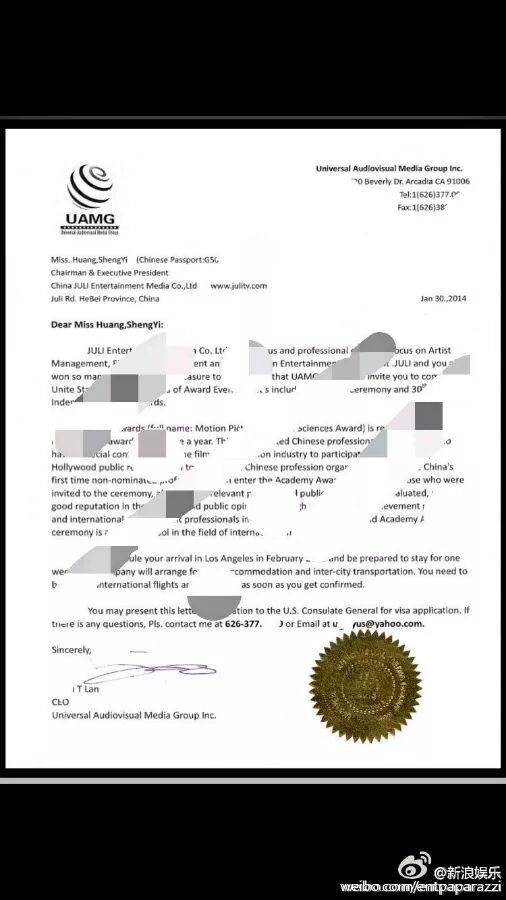 在舆论的强压下,扬子公开了奥斯卡邀请函,却被网友打脸邀请函的邀请公司竟然是空壳公司。