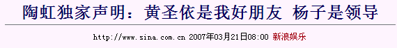 2007年,突然传出扬子已经结婚的消息,妻子陶虹还是杨氏企业的一员。为此,陶虹公开发表声明《黄圣依是我好朋友 杨子是领导》,不但否认了自己和扬子的关系,而且说黄圣依是自己多年的朋友。杨子方面也立刻否认已婚,助理称不认识陶虹。