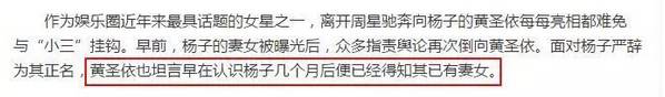 而黄圣依在李湘的节目上承认,认识杨子时已经知道他有妻女。