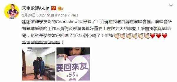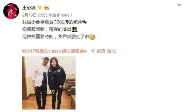 还有杨丞琳、王心凌、潘玮柏、范晓萱、A-lin、徐佳莹、曾沛慈等明星都跑去了,难怪有博友惊呼:感觉全台湾的明星都去看了张学友的演唱会!