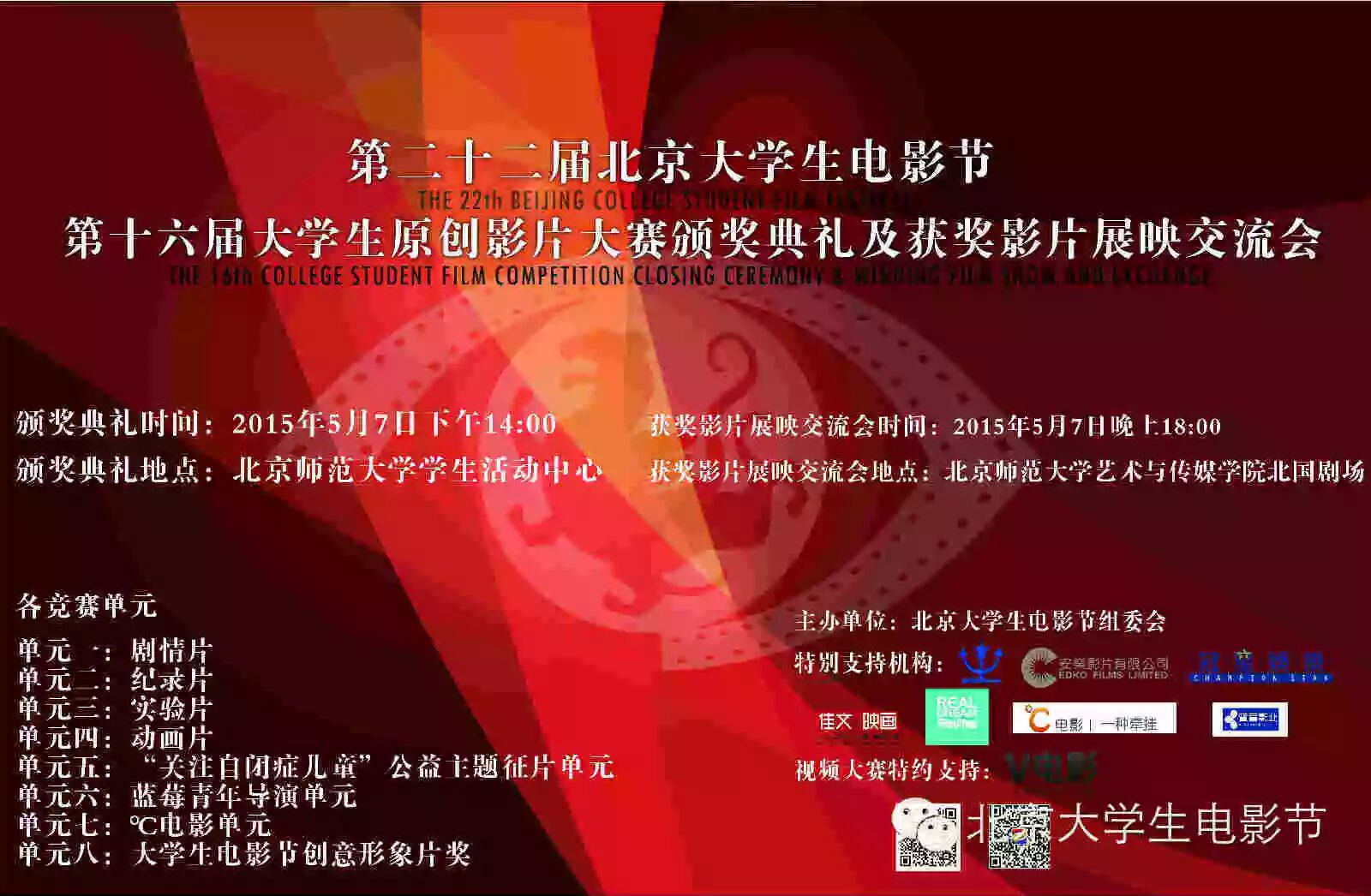 2015年5月7日下午14:00,第22届北京大学生电影节第16届大学生原创影片大赛获奖名单揭晓,颁奖典礼当日在北京师范大学学生活动中心举行。今年共有3600部作品参赛,经过层层评审,最终决出 34个奖项。