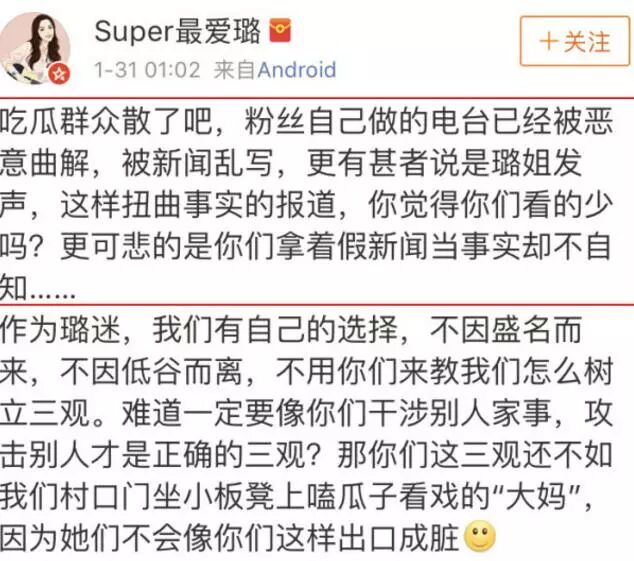 不过在今日(1月31日)一名超级粉丝在微博写道:“吃瓜群众散了吧,粉丝自己做的电台已经被恶意曲解,被新闻乱写,更有甚者说是璐姐发声,这样扭曲事实的报道,你觉得你们看的少吗?更可悲的是你们拿着假新闻当事实却不自知……”里面还提到其实李小璐的璐迷电台已经连续办了很多期了,鸡汤也是每期都有的,没想到近期的被恶意曲解了。