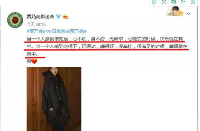 而贾乃亮官方影迷会发出的消息就更让人联想翩翩:当一个人感到很知足,心不烦,身不疲,无所求,心能安的时候,快乐就在其中。当一个感到吃得下,玩得动,睡得好,没牵挂,很满足的时候,幸福就在其中。这难道是在暗示贾乃亮没做亏心事,一直很心安吗?与李小璐影音馆发的“不要诋毁”连起来看,难道是这对夫妻杠上了?